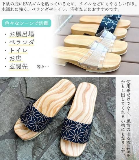 下駄の底にEVAゴムを貼っているため、タイルなどにもやさしい作り。